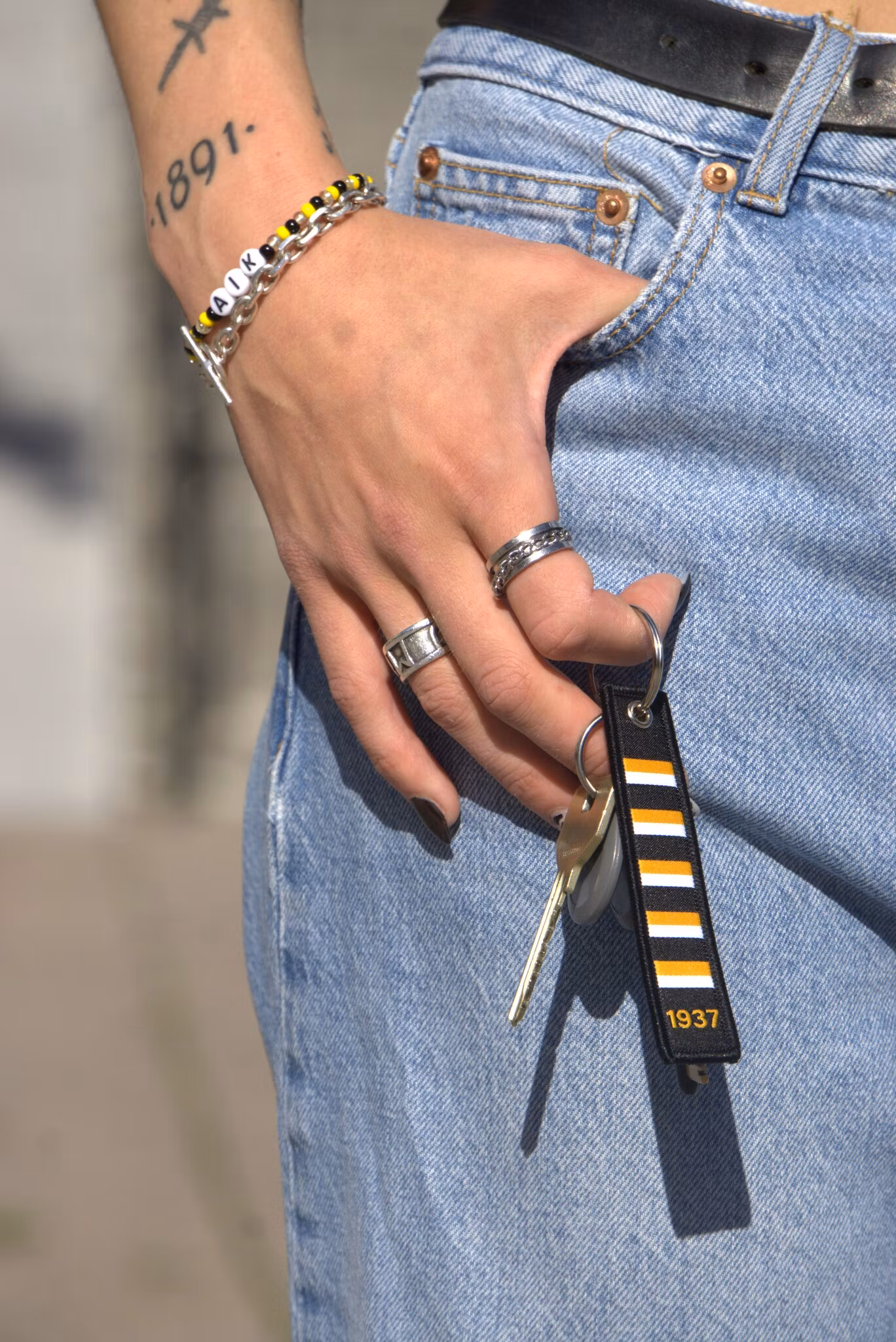 En klassisk nyckelring i svart med vita och gula detaljer. Subtila hyllningar till Råsunda i form av årtalen 1937 och 2012 på varsin sida.